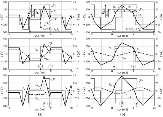 Ideal high-frequency (HF) ac-link voltage/current waveforms for (a) Switching mode 1: low input current/power intervals and (b) Switching mode 2: high input current/power intervals, being derived using: V, V, and kHz. For mode 1 the selected modulation parameters are: rad., rad., rad., resulting in A. For mode 2 the selected modulation parameters are: , , , resulting in A.