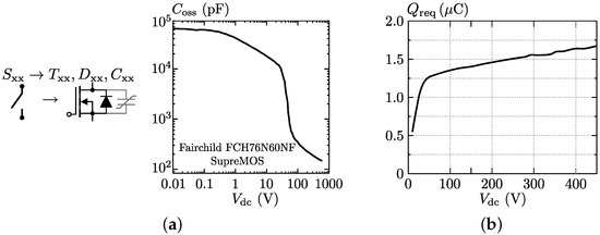 (a) Characteristic of the non-linear parasitic output capacitance of the used FAIRCHILD FCH76N60NF MOSFETs ; (b) Charge required to charge/discharge the MOSFET’s non-linear parasitic output capacitance from 0 V to (or vice versa) during commutation of a bridge leg.