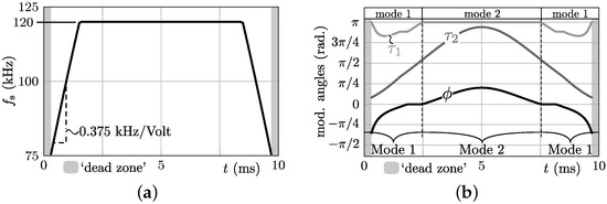 A nominal switching frequency of kHz is selected to accommodate a compact converter design without causing excessive switching frequency related losses. Moreover, thermal limitations apply at high switching frequencies, resulting in an increased total converter volume. The frequency of 120 kHz is chosen to stay well below these thermal limits. Furthermore, it has been been shown in [25] that at both ends of the 10 ms half mains period, where the DAB input voltage is low (see Figure 2), it is beneficial to linearly reduce . In these regions, ZVS is hard to achieve without making commutation inductances and very small, which would result in unacceptably high circulating currents and thus a low conversion efficiency. This has led to the following predefined switching frequency pattern (see also Figure 6a of Section 3.4):