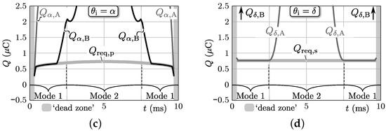 Figure 6 illustrates the relevant simulation results that are obtained using the constrained numerical optimization algorithm presented in [25] for a run through a half-cycle (i.e., ms) of the nominal ac input voltage (, ) at the nominal ac input current of (positive power flow) and the nominal dc output voltage of V. Note that the values applied for correspond with line in Figure 2. The used circuit variables are derived in the previous section and are listed in the right inset of Figure 1 while the predefined switching frequency pattern () is given by (12) and shown in Figure 6a. The modulation parameters that result from the simulation are shown in Figure 6b, expectedly comprising only switching modes 1 and 2. From Figure 6c,d it can be seen that the available commutation charges and at the two most critical switching instants are higher than or equal to the minimum required commutation charges for achieving ZVS, i.e., respectively (primary-side active bridge) and (secondary-side active bridge). The same goes for the available commutation charges at the non-critical switching instants , γ} which are not shown for brevity. This means that ZVS of all the semiconductor devices is guaranteed in all operating points of the simulation run.