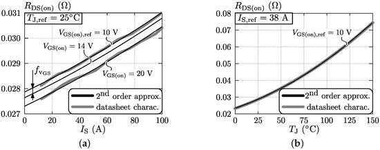 To calculate the resulting conduction losses using (15)–(19), the dependency of the MOSFET’s on-resistance on the junction temperature and on the switch current has to be modeled. Figure 7 depicts these dependencies for the FCH76N60NF MOSFETs. The datasheet characteristics (gray lines) can be described by a second order approximation (Similarly, a second order approximation can be used to describe the characteristics of the SR’s STY112N65M5 MOSFETs.) (black lines) according to: