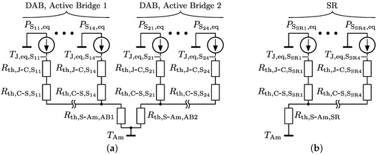 for the used MOSFETs are given in Table A1 of Appendix A.1, while for all switches is defined by where is the thickness ( m), the thermal conductivity ( W/mK), and the cross section area of the thermal pads ( m for the FCH76N60NF MOSFETs and m for the STY112N65M5 MOSFETs). (=) and are obtained from the heat sink optimizations performed in Section 4.1.4. Referring to Figure 9, the equivalent junction temperature of a switch can now be expressed as: