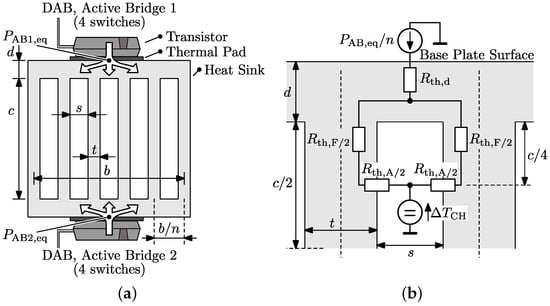 (a) Heat sink geometry with dual-sided base plate, considered to cool the switches of the DAB’s active bridges; (b) Thermal network describing stationary heat transfer between the surface of a base plate and the air in the heat sink channel (temperature ).