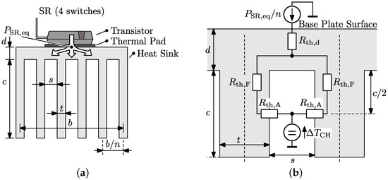 The surface-to-ambient thermal resistances (=) and of the forced-convection-cooled heat sinks are obtained from optimizations in which the heat sink geometries are determined in a way that, for a given fan and for given outer heat sink dimensions, these thermal resistances are minimized. This involves calculation of the thermal resistance for conductive heat transfer through the heat sink material, the thermal resistance for convective heat transfer, and the temperature increase of the air flowing through the heat sink channels. The applied optimization procedure and thermal models are described in detail in [33,34], and are summarized in the following, only considering stationary heat transfer. The involved variables are given in Table 2 (, , , and are slightly temperature dependent. In order to simplify the analysis, the values at an average channel air temperature of = 80 C are used).