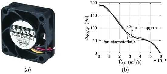 Based on (53)–(56) of Appendix A.1, the air flow pressure drop in the heat sink channels for laminar (‘lam’) and turbulent (‘turb’) flow can be calculated. Balancing the pressure drop with the pressure of the fan, as defined by the fan characteristic in (57), gives the fan’s operating point which defines the air flow and pressure drop in the heat sink channels. Using (58), the Reynolds number is found as well. In case of laminar flow, with Re < 2300, Equation (59) is used to calculate the Nusselt number, which describes the convective heat transfer from the channel walls into the air. In case of turbulent flow, with Re > 2300, the Nusselt number is calculated with Equation (60). Using (61), the convective heat transfer coefficient h of the configuration is finally found.