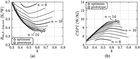 By repeating the above procedure for different heat sink geometries, an optimal set of geometrical parameters (d, t, b, c, s, L, and n) can be found which leads to the lowest thermal resistance . This is done for both heat sinks, assuming predefined outer heat sink dimensions (i.e., variables b, c, L, and d). As a result, the geometric parameters that are varied during the optimization are the number of channels n and the fin spacing ratio k, which is equivalent to varying the channel width s; see Equation (54). The results are discussed below.