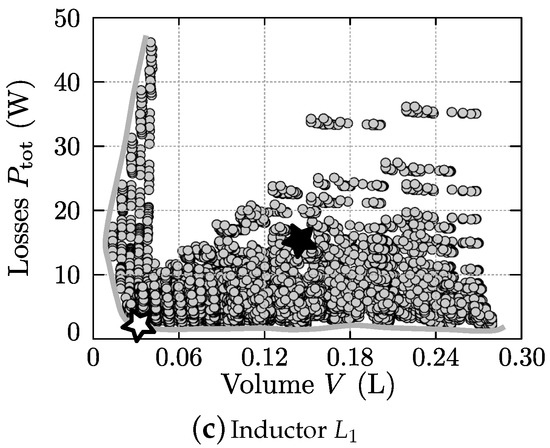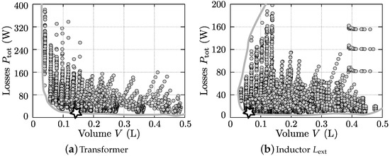 Based on the ZVS modulation scheme, the switching frequency pattern (), and circuit variables derived in Section 3, in this section the main functional elements of the 1-S DAB ac-dc converter are designed and optimized. Each sub-section is dedicated to the design of the individual elements, combining state-of-the art design methods/procedures, models for the component losses, and volume models with custom developed component-level optimization algorithms in order to obtain a high-efficiency and high-power-density converter design that is in compliance with the system requirements specified in Table 1.