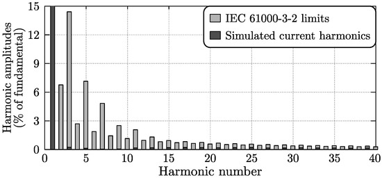 - The International Electrotechnical Commission. Electromagnetic Compatibility (EMC)—Part 3-2: Limits for Harmonic Current Emissions (Equipment Input Current ⩽16 A per Phase); IEC 61000-3-2; IEC, International Electrotechnical Commission: Geneva, Switzerland, 1995. [Google Scholar]