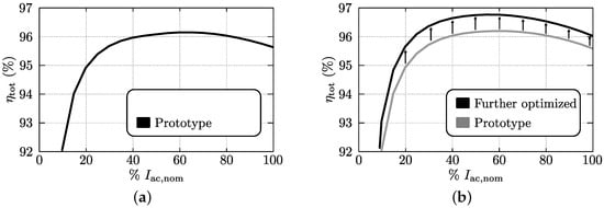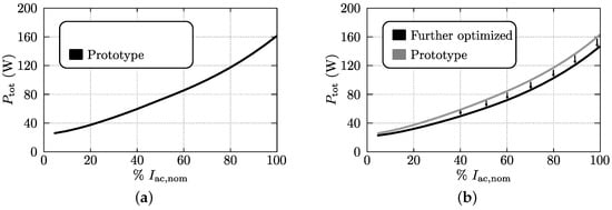Calculated losses of the commutation inductor implemented according to (a) design “prot.” (prototype converter) and (b) the improved design “opt.” (further optimized).