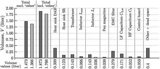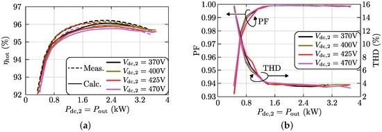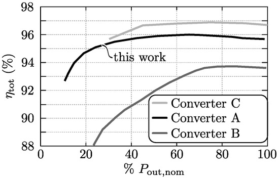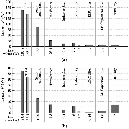 Since the modulation scheme derived in Section 3.2 results in full-operating-range ZVS of the DAB, switching losses can be neglected in the analysis [10,28]. Therefore, only conduction losses and the losses of the gate drive units are considered. For the SR also the gate drive losses can be neglected as the MOSFETs of the SR are low-frequency switched (100 Hz).