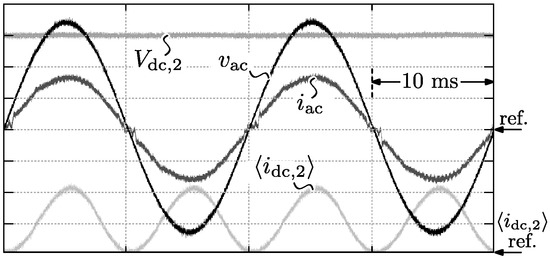 Since the differential mode (DM) EMC input filter capacitance (see Section 4.4.1), which includes capacitor , draws a small reactive current from the grid, this current should be compensated in order to achieve unity power factor. This is done by controlling slightly lagging on , as can be seen in Figure 2 which depicts , , and within a 10 ms half period of the grid voltage for ac line current values of and (Note that around the zero crossing ( V V) the bridges of the DAB are inactive (‘dead zone’) as zero voltage switching (ZVS) power conversion is quasi impossible when the input voltage of the DAB is close to zero [25]). These currents respectively correspond to and of the nominal ac input power of . The exact control equation for , which compensates for , is given by Equation (2) of [25] and is not shown here for brevity of this paper. For the same reason, in the following only positive power flow operation () is discussed as, due to symmetry, the analysis and results for negative power flow are identical. It should be noted that the double line frequency (i.e., at ) component of the converter’s ac input power is directly transfered to the dc output side, which is due to the absence of a large intermediate dc-link energy storage element within this single-stage converter architecture. As discussed in Section 4.3.1, an electrolytic capacitor is placed at the dc output to (partly) filter this 100 Hz power component and prevent low-frequency (LF) stress on the load (e.g., battery).