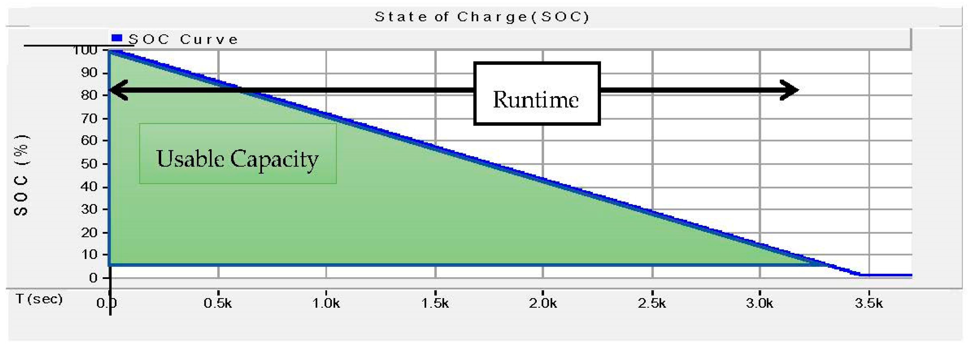 Information about the proper capacity sizing of the battery can be obtained from this result. A situation was assumed below to verify the impact of runtime comparisons between different DCMs on the battery sizing. The situation is that the battery was designated to feed a critical load from 6:00 p.m. to 6:00 a.m. and it must be recharged again from 6:00 a.m. to 6:00 p.m. During 6:00 a.m. to 6:00 p.m. both the critical load and battery will be supplied by a utility. The utility is scheduled to supply only from 6:00 a.m. to 6:00 p.m. Since the load is critical the battery must supply every second from 6:00 p.m. to 6:00 a.m. which requires a proper capacity sizing. Only two cases out of the possible cases are discussed below: