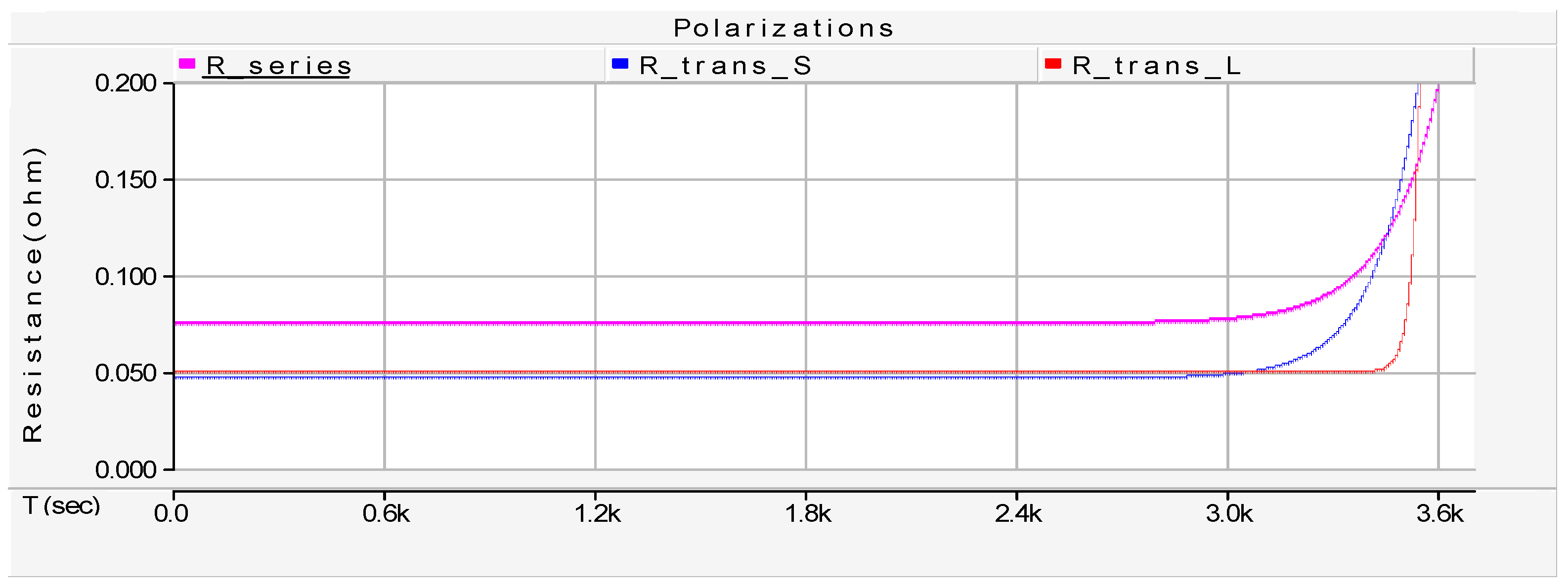 The initial resistance value was taken as such a value that the initial discharge was set to 1 C for all loads and all loads will continue to flow at 1 C till the end of discharge in the case the battery supplies a constant voltage. Since the battery voltage changes with time, the loads also change following the change in battery voltage. The dependence of usable capacity on ambient temperature and self-discharge has not been included in the simulation for the following reasons.