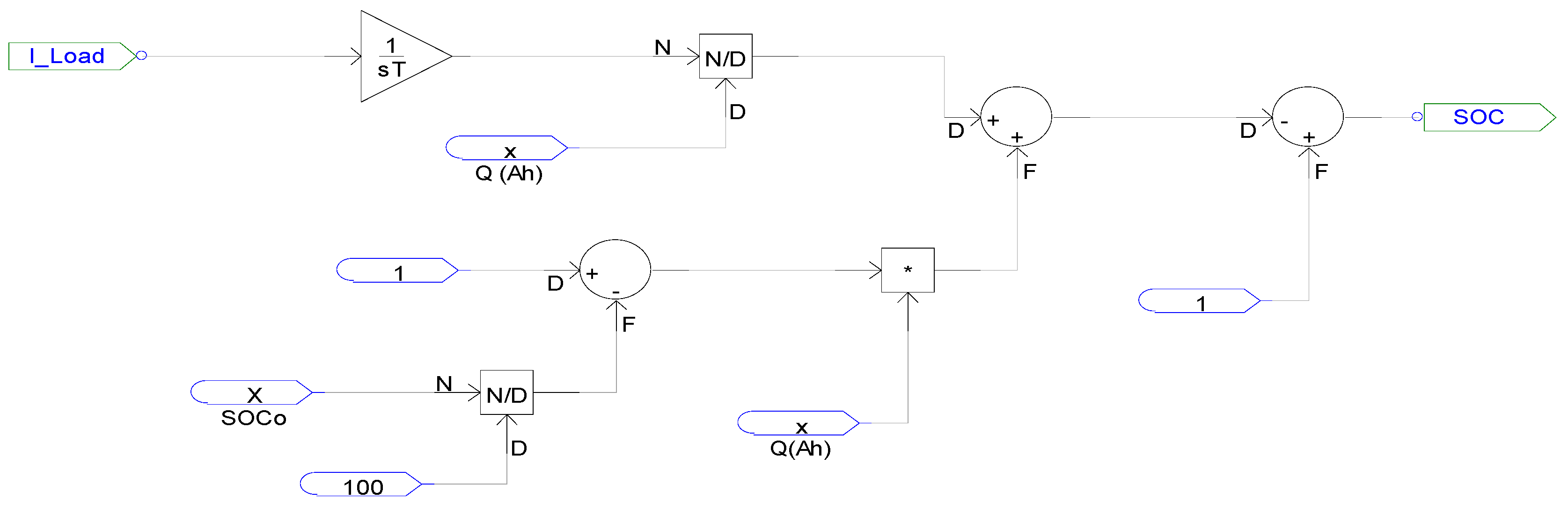 The second module quantitatively estimates the SOC based on the voltage of a capacitor. In this paper we have modified this module so that it can estimate SOC as a function of discharge current. The subsystem designated for SOC estimation based on capacitor voltage was replaced with a mathematical model based on the “Coulomb Counting Method” without sacrificing accuracy. The Coulomb counting method uses the current flowing in (charging mode) and flowing out (discharging mode) of the battery and integrates this current over time in order to determine the battery capacity (Q) for SOC estimation.