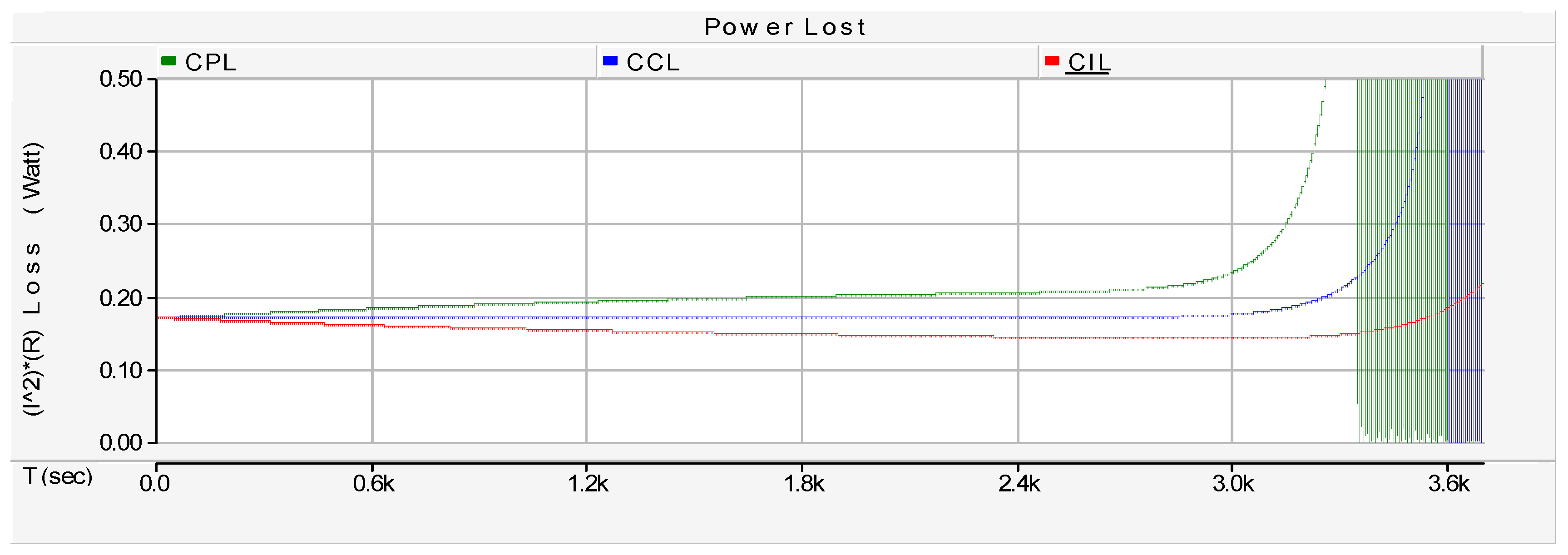 Figure 15) which indicates the minimum power lost in CPM among the modes. Thus battery discharge in CPM has the highest efficiency. The same result can also be inferred from the power profile of the battery. To supply the same output power the initial power required for the CPM is least as shown in