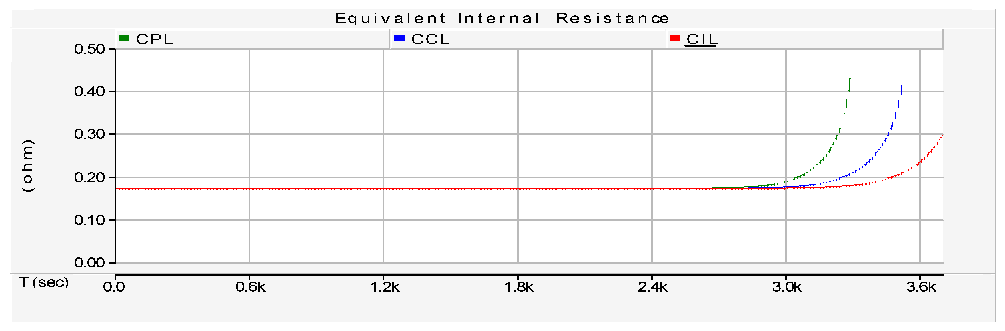 Figure 14 depends on the discharge current and internal resistance of the battery. The internal resistance for all the modes is almost same in the operational region, as can be seen in