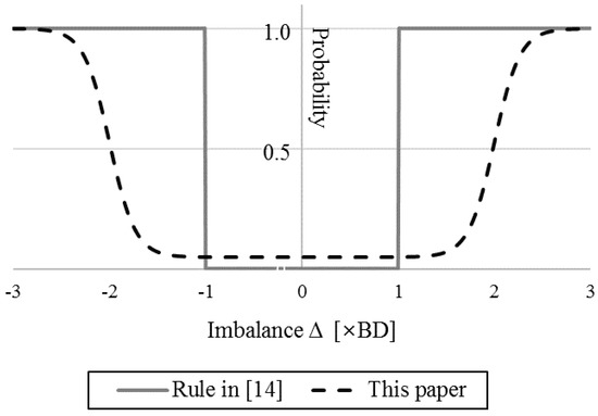 where , , and are constant coefficients and can represent the grid condition. For example, two coefficients and may indirectly reflect the remains of spinning reserve or ISO’s load shedding operation scheme, and can represent the line fault probability. The dashed line in Figure 1 is an example of Equation (12). This figure shows that an islanding event occurs stochastically even if an MGO violates its reserve band contract, and the occurrence probability increases as the imbalance generated by the MGO increases. A comparison of Equations (1) and (10) shows that the shape of the conditional probability function in Equation (1) can be derived as the solid line in Figure 1. This quantum-well-shaped probability function is consistent with the fact that, according to [14], an islanding event occurs unconditionally when an MGO violates its reserve band contract.