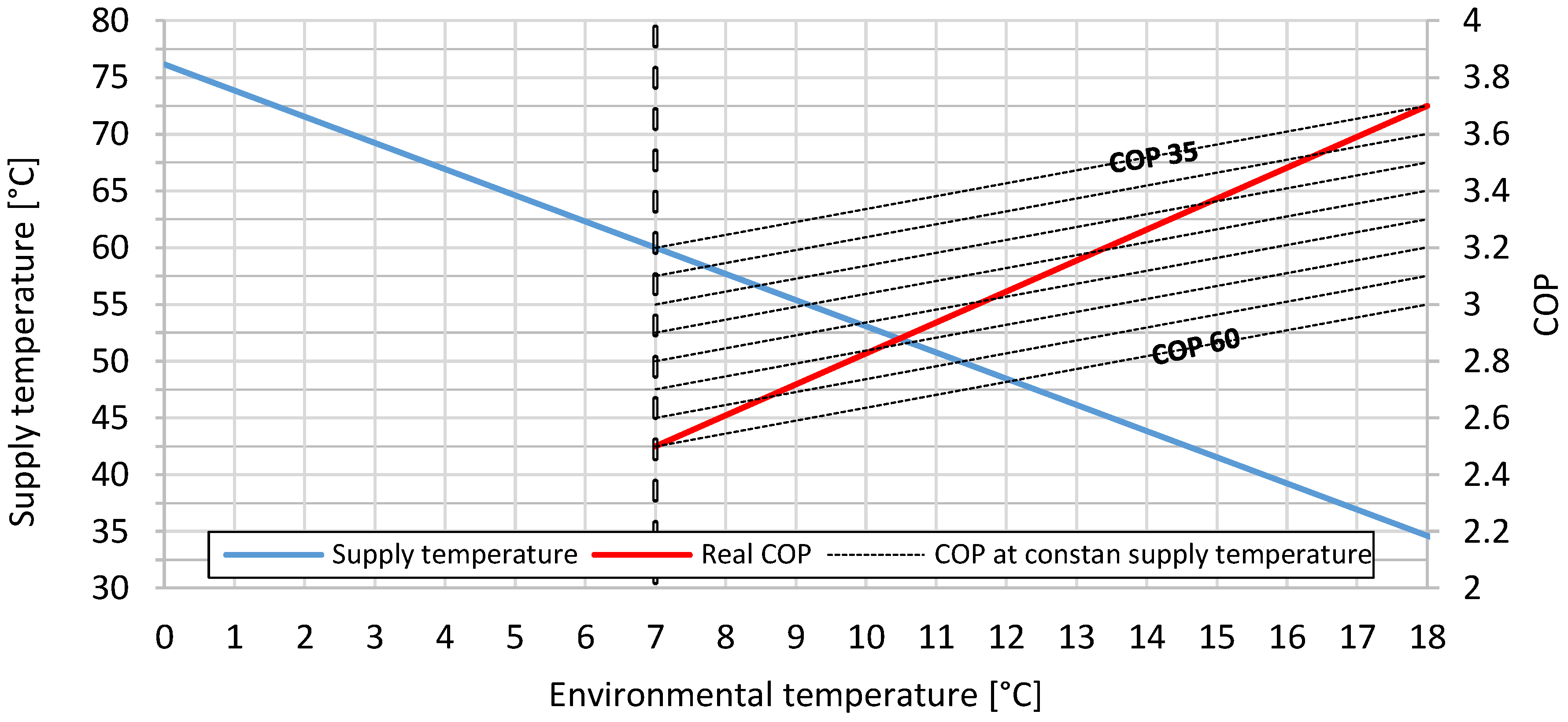 Figure 3, are the dashed ones that are to be read on the left y-axis. They represent the curves of COP, as a function of the external temperature, with the supply temperature as a parameter, as they can be obtained from most of the technical sheets. In this case, for an air HP, the COP drops sharply when outside temperature is below 7 °C because of freezing and, for this reason, it has been decided not to draw the curves below such limit.