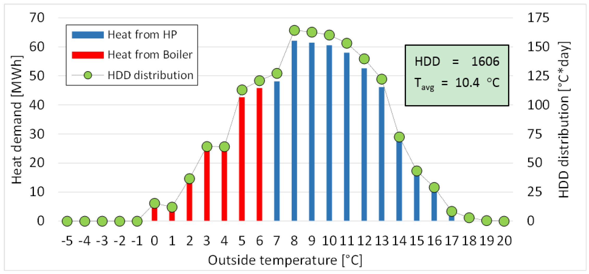To estimate the yearly load of the HP and boiler, it is firstly necessary to analyze the average temperature distribution, over a heating period, in the selected zone. The analysis starts from the construction of the distribution curve of the average daily temperature from which, by means of a simple correlation, the corresponding HDD distribution curve is obtained.