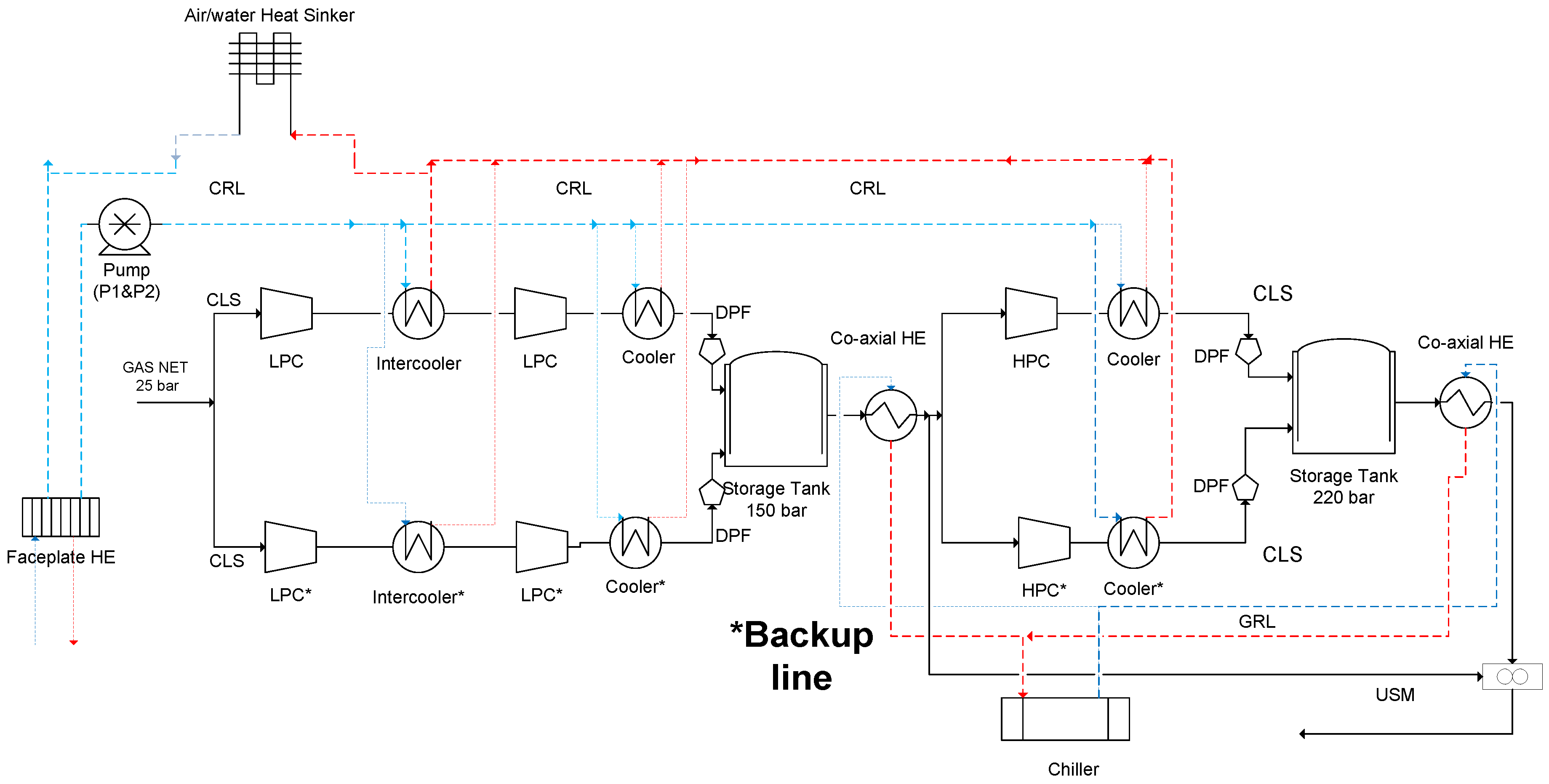 Figure 7, consists in six main subsystems respectively: compression lines and storage (CLS), compressor refrigeration loop (CRL), gas refrigeration loop (GRL), damping panel and filtering (DPF), user supply and metering system (USM), and, finally, control and security system (CSS).