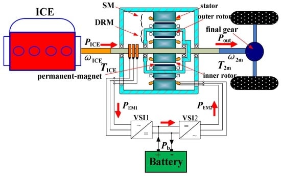 Figure 1. The high degree of integration between DRM and SM makes up the CSPM motor system, which is between the ICE and final gear. The inner rotor is coaxial with the ICE, and the outer rotor is connected to the final gear in the HEV, which has two independent mechanical output shafts. From
