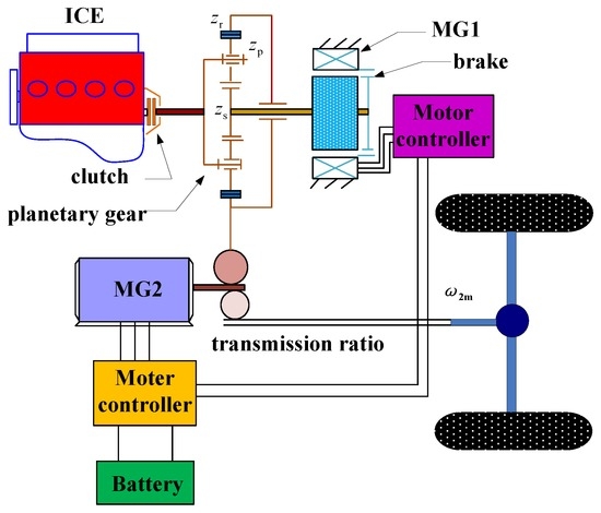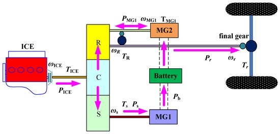 Figure 2, the output shaft of ICE is connected to the carrier of the planet gear, then the output power is transmitted to the sun and ring gears, respectively. The sun gear is connected to the generator (MG1, (motor generator1)), which can be used as the input or output port. The ring gears act as an output port connected to the motor (MG2) and transmission shaft through a torque coupler. Most output energy of the ICE is engaged with the ring gears through the carrier, which transmits the energy to the driving shaft; while the rest of the energy is transmitted to the MG1 by the mechanical coupling of the carrier and sun gears. The mechanical energy is converted into electrical energy in MG1 to charge the battery or supply MG2, then the driving force is increased. The planetary gear system can be regarded as a torque coupler, which transmits the driving force to the wheel [