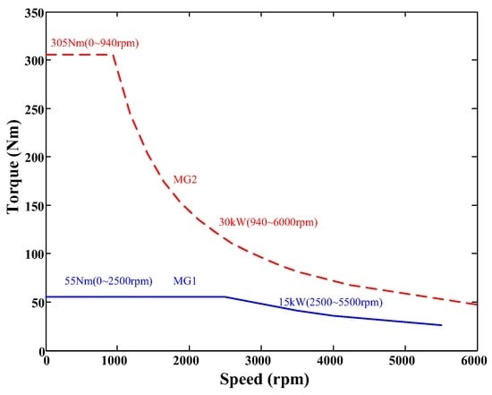 From Equations (8) and (9), it can be seen that EM2 and MG2 have the same speed association constraints, which are equal to the speed of the driving shafts, respectively. Under the same speed of driving shaft, the speeds of EM2 and MG2 are equal, as shown in the Equation (10):