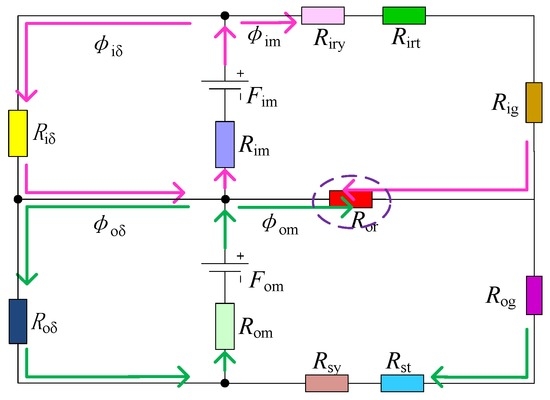 Fim, Fom are the equivalent magnetic motive forces produced by the inner and outer layer permanent magnets; φim, φom are the main magnetic fluxes in the DRM and SM; φiδ, φoδ are the equivalent leakage fluxes in the inner and outer layer permanent magnets; Rim, Rom are the equivalent reluctances of two-layer permanent magnets; Riδ, Roδ are the equivalent leakage reluctances of two-layer permanent magnets; Riry, Rirt are the yoke, teeth reluctances of the inner rotor; Rsy, Rst are the yoke, teeth reluctances of the stator; Rig, Rog are the reluctances of the inner and outer air-gap; and Ror is the reluctance of the outer rotor.