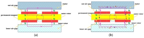 On both sides of the outer rotor are placed permanent magnets, the magnetization direction of which can be divided into consistent and opposite. In the consistent magnetization direction, the flux line directions in the outer rotor produced by DRM and SM are opposite, which can offset each other, as shown in