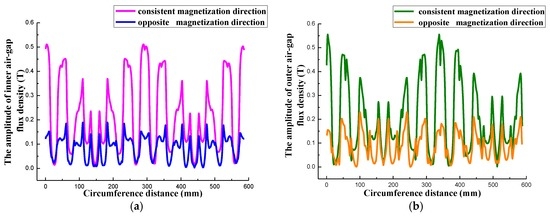 In order to analyze the influence of magnetization directions further, the amplitudes of the air-gap flux density curves of the inner and outer air-gap in different magnetization directions are shown in