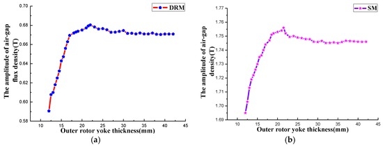 Accurate analysis of the distribution of the air-gap magnetic field is the key to study the magnetic properties of CSPM. From the above analysis, we can know that the magnetic flux in the outer rotor is proportional to its resistance, which can be changed by the yoke thickness. Meanwhile, the air-gap flux density can be influenced by the saturation degree of the outer rotor, so we use the air-gap flux density to reflect the magnetic flux in the outer rotor. By changing the yoke thickness of the outer rotor, the curves of the air-gap flux density amplitude in the DRM and SM are shown in