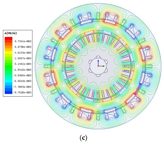 Figure 13c shows the numerical value of the magnetic field intensity of CSPM. We are aware that the values of the stator slots and inner rotor slots are huge, while in the stator and outer rotor yoke, the numerical value of the magnetic field intensity is small. Thus, the two motors can work without interference. At this time, the magnetic coupling degree of the two motors is very small and even can be ignored, i.e., the magnetic decoupling of the CSPM motor is complete. The control difficulty is decreased, and the output torque and power density are increased. Coupled with the appropriate control strategy, the excellent performance of the CSPM motor can be realized. This also avoids a large volume of the device, so further demonstrating the validity of the internal magnetic decoupling scheme, which provides a reference for the optimization design of the CSPM motor.