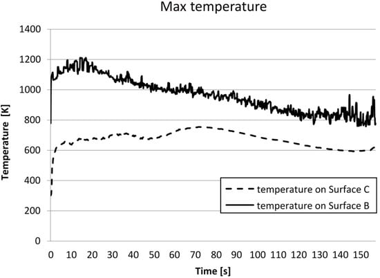 Figure 4 where it is possible to see that the highest temperature is registered on surface B, which reaches values of about 1200 K after a few seconds from opening and then decreases, reaching values of 800 K. Instead, the maximum temperature registered on surface C starts from the ambient value, up to values of around 700 K.