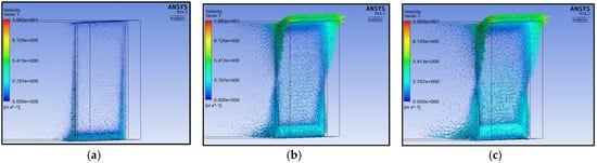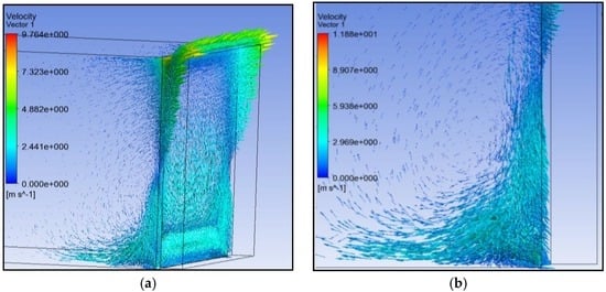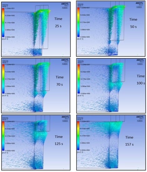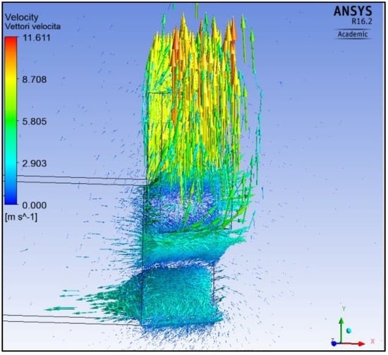 Figure 5 shows a sequence of velocity vectors from the initial time, up to 1 s. This sequence of frames demonstrates how the hot gases inside the chamber move upwards and leave the furnace through the upper section with a velocity that reaches 12 m/s. Meanwhile, the external air, at ambient temperature, moves towards the furnace through the bottom section.