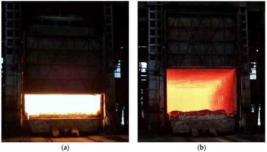 The validation of the model was carried out through an experimental test made in SdF. The test started with the opening of the door of an empty forging furnace at the operating temperature of 1230 °C. The furnace remained open for 10 min with the bogie hearth inside, and then closed again. When the door was completely closed the burners started to call up to reach again the operating temperature. Two instant photographs of this experimental test are reported in