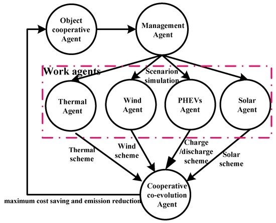 In this paper, the proposed MAS for UC in smart grid consists of a thermal agent, wind agent, solar agent, PHEV agent, management agent, object cooperative agent, and a cooperative co-evolution agent. In MAS, the thermal agent, wind agent, solar agent and PHEV agent combine into work agents. Each work agent is responsible for coordinating the static scheduling of wind, solar power, TUs and PHEVs, the constraints are static for the corresponding time interval, without considering the dynamic time coupling constraints. The work agents are solved by GA with adaptive crossover and mutation operators. These agents not only have the self-target solving ability but also can achieve the common goal by their mutual cooperation. They are independent from each other. In order to achieve the system goals, the agents have to coordinate with each other through communication. Even though the goals of agents are independent, they are cooperative in the system goal optimization. The MAS of the smart grid is shown in Figure 1.