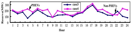 The load curve of the 10-unit system with wind and solar power has both peaks and valleys. According to the load curve, demand is relatively low during the hours from 1st to 7th, from 16th to 18th and from 22nd to 24th; demand is relatively high during the hours from 8th to 15th and from 19th to 21st. PHEVs can be charged from the grid during the off-peak load to level the demand, it can be discharged from the grid during the peak load. They maximize renewable energy use for charging, and when it is not enough, using low cost and pollutant units’ power for charging. In the proposed method, an extra 411 MWh load for 50,000 PHEVs is intelligently distributed among off-peak hours, while these PHEVs smartly discharge among peak hours so that cost and emissions are minimized. From Figure 3, the difference between peak and valley changes from 800 MW (in case 3) to 666.5 MW (in case 4), a reduction of 133.5 MW. By intelligent charging and discharging control of PHEVs in the smart grid, load leveling is better than typical static load leveling. It reduces the system dependence on high cost, high emissions units, enhancing the ability of energy-saving emission reduction.