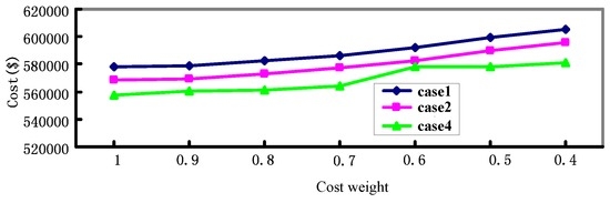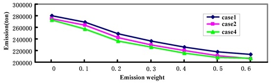 From Figure 4 and Figure 5, emissions are always high when cost is mainly considered in the model to generate a low cost schedule. On the other hand, emissions are always low and cost is very high when emissions are mainly considered in the model to generate an environmental friendly schedule. With the same cost and emissions weights, among the three cases, the operation cost in Case 4 is the lowest, in Case 1 is the highest, and in Case 2 is the middle. When the system operation cost is the highest, the corresponding emissions are the greatest. Taking the cost and emissions weight (0.8, 0.2) as an example, the operation cost is $582,329.6 and the emissions are 248,920.4 t in Case 1; the operation cost is $573,136.8 and the emissions are 242,164.4 t in Case 2; the operation cost is $561,436.6 and the emissions are 236,585.4 t in Case 4. The cost is reduced by $20,893 ($582,329.6 − $561,436.6) and the total emission is reduced by 12,335 t (248,920.4 − 236,585.4 t). According to Figure 4 and Figure 5, with the reduction of , increases, the operation cost increases, while the emission reduces. For practical use, values of and should be chosen carefully considering price, environment effects, consumers’ and system operators’ demand. So the trade-off can be found between cost and emissions in this paper.