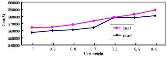 Similarly Figure 6 and Figure 7 show the cost and emissions with and without PHEVs in different weights. From Figure 6 and Figure 7, taking the cost and emissions weight (0.8, 0.2) as an example, the operation cost is $568,568.5 and the emissions are 241,552.8 t in Case 3; the operation cost is $561,436.6 and the emissions are 236,585.4 t in Case 4. Total emissions are reduced by 4967.4 t (241,552.8 − 236,585.4 t) per day and cost is reduced by $7,131.9 ($568,568.5 − $561,436.6) per day. By PHEVs’ intelligent charging and discharging control, the system’s dependency on small expensive and pollutant units in peak hours is reduced. In this way, PHEVs help to reduce both cost and emissions in power systems (Figure 6 and Figure 7). Therefore intelligent UC with PHEVs, for both cost and emission optimization, is essential in power systems.