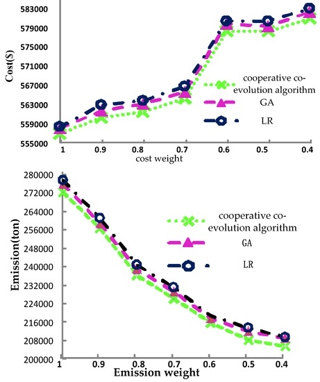 As shown in Figure 8, the costs and emissions of the proposed cooperative co-evolution algorithm are shown to be less than those of GA [32], LR [33] in Case 4 with the same weights. Taking the cost and emissions weight (0.8, 0.2) as an example, the findings are as follows: (1) the operation cost and the emissions of GA are $563,186.5 and 239,064.2 t, respectively; (2) the operation cost and the emissions of LR are $563,815.4 and 240,854.4 t, respectively; (3) the operation cost and the emissions of the proposed cooperative co-evolution algorithm are $561,436.6 and 236,585.4 t, respectively. Among the three methods, the operation cost and emissions under the proposed cooperative co-evolution algorithm are the lowest. Total emissions are reduced by 4269 t (240,854.4 − 236,585.4 t) per day and while total costs are reduced by $2,378.8 ($563,815.4 − $561,436.6) per day.