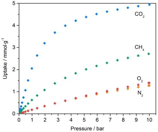 Gas adsorption isotherms measured for Y(btc) at 298 K demonstrated good uptake of CO2, the measured value of around 5 mmol·g−1 at 10 bar being almost twice the uptake of CH4 and four times that of O2 or N2 at the same pressure and temperature (Figure 2). Uptake kinetics for all gases were very rapid, with equilibration achieved within ~2 min after each dose was applied to the sample. Water adsorption in Y(btc) was found to be fully reversible and the isothermal curve was reproduced after a second adsorption cycle, highlighting the relatively-good stability of the material to moist environments (Figure S1).