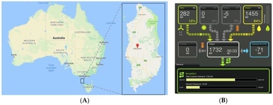King Island (Latitude 39.9 S, Longitude 144 E) is located at Tasmania’s northwest, between Victoria and Tasmania (Figure 3A). The population of King Island is 1600 residents as in year 2014 [8], the majority are living in Currie. It is common for off-grid and remote communities like King Island to obtain electricity via conventional diesel generators. However in King Island, an innovative power system was developed to supply over 65% of King Island’s energy needs using renewable energy, thereby reducing carbon dioxide emissions by more than 95% [9]. This power system consists of a hybrid of solar, wind, and diesel/biodiesel power generators and a battery, fly wheel, and a resistor for energy storage. These power options are connected via a smart grid technology that helps match the island’s energy needs with the available energy supply sources. The aim of this project is to allow the power system to rely less on diesel generation and provide a reliable and stable electricity supply while reducing carbon dioxide emissions. To increase community awareness/participation in the power generation/management portfolio of the island, a live data display is demonstrated online representing the proportion of power generation/storage/usage at every time step (Figure 3B).
