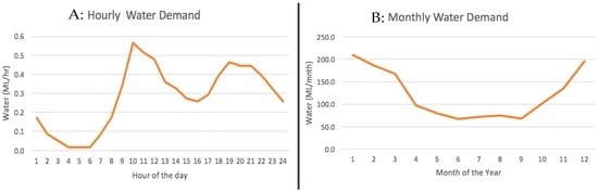 Freshwater consumption profile on (A) hourly (the data is plotted for 1 January); and (B) monthly basis.