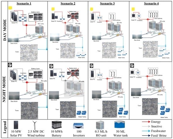 To compare energy and water storage compatible with different renewable energy sources, four potential scenarios are considered. The objective of this comparison is to determine the most feasible option that can sufficiently meet the variable load at all times and at the lowest cost. These four scenarios are described above and depicted in Figure 6. Each of the symbols used for solar PV field, wind turbine, batteries, inverters, RO units, and water storage tanks are scaled to a particular capacity as outlined in the legend. The energy, freshwater, feed/brine water, and inactive streams also clarify the operation schemes in day and night modes. In Scenario 1, the solar PV field is sized to meet instant water load in day times and store excess electricity in a supplementary battery set. The inverters are also sized to convert the DC current at the PV outlet to AC current, usable by the pumps to bring the feed water pressure to the design point. As the desalination plant is always available to work on-demand, the design capacity should be able to meet the highest demand (worst case), although most of the times, it only needs to operate on partial load. This arrangement over-sizes the solar PV field, invertors, and battery storage capacity accordingly, but comparatively lowers the size of RO desalination plant. In Scenario 2, the batteries are eliminated but the desalination plant capacity is increased to produce more water during the day and shutdown at night times. The adequate sizing of water storage tanks, that store excess water, is able to control demand; extra water produced in the summer season helps in responding to demand in the winter without the need for oversizing solar PV field to respond to winter energy deficits. In Scenario 3, this concept is further elaborated by reducing solar PV field and introducing 2 × 2.5 MW wind turbines. The benefit of wind turbines is in providing energy, although intermittent, when most needed (most valued in night times and winter season). This combination is expected to decrease solar PV field size and water storage capacity as of Scenario 2. In Scenario 4, the role of wind contribution is doubled by employing 4 × 2.5 MW wind turbines. Although this scenario will increase the cost of wind farm, but it will also significantly reduce the solar PV field and water storage capacity. The main economic assumptions adopted for these four scenarios are presented in Table 3.