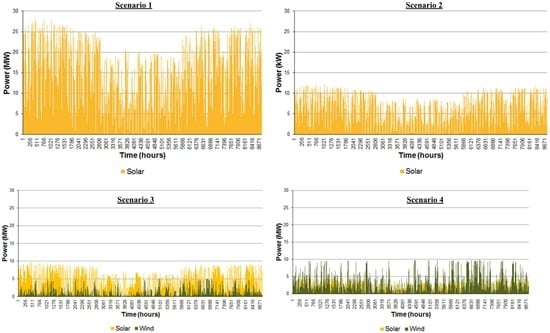 Scenario 4: Similar to Scenario 3, but optimized for larger wind farm (four wind turbines) and smaller size for solar field.
