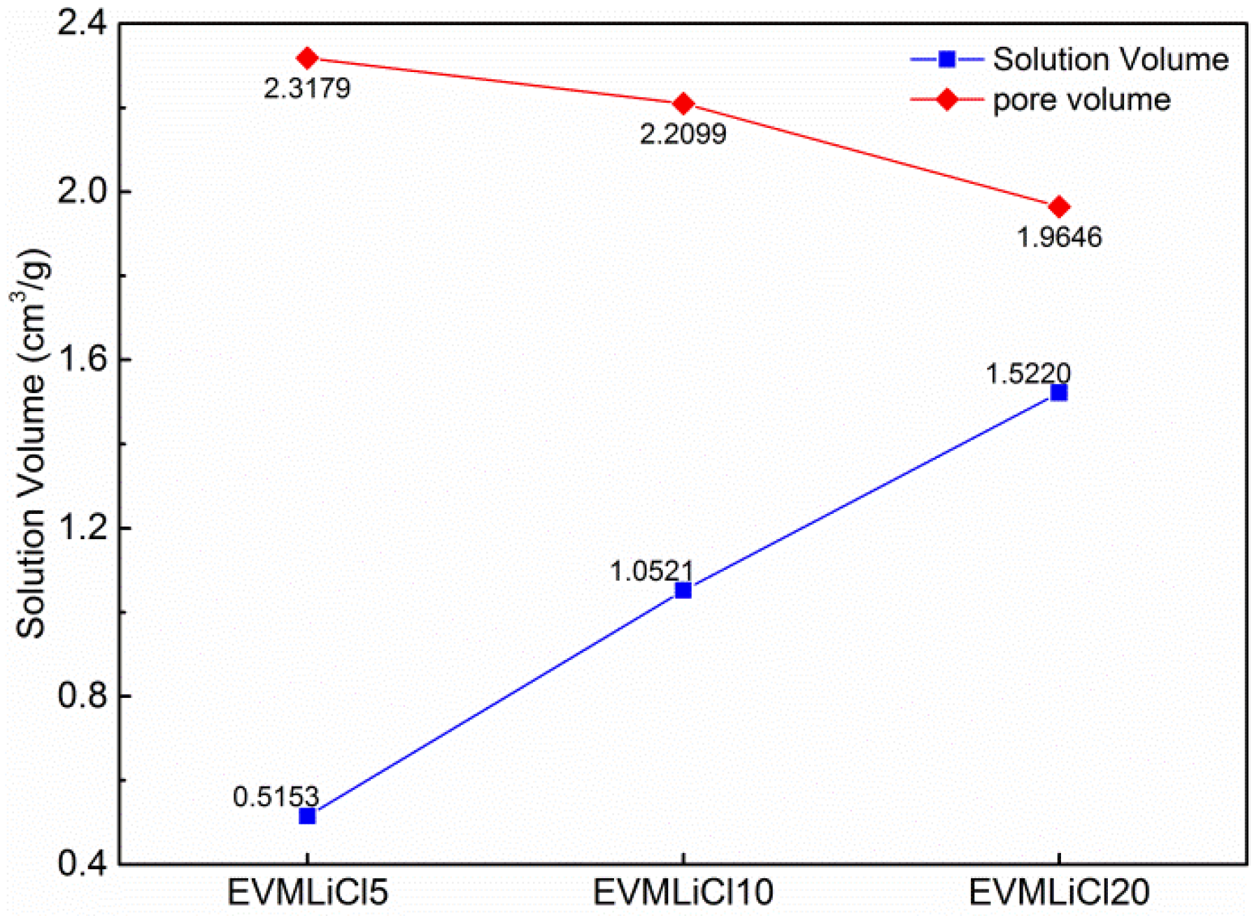 | Volume of LiCl crystals (cm3/g) | 0 | 0.067 | 0.133 | 0.183 |