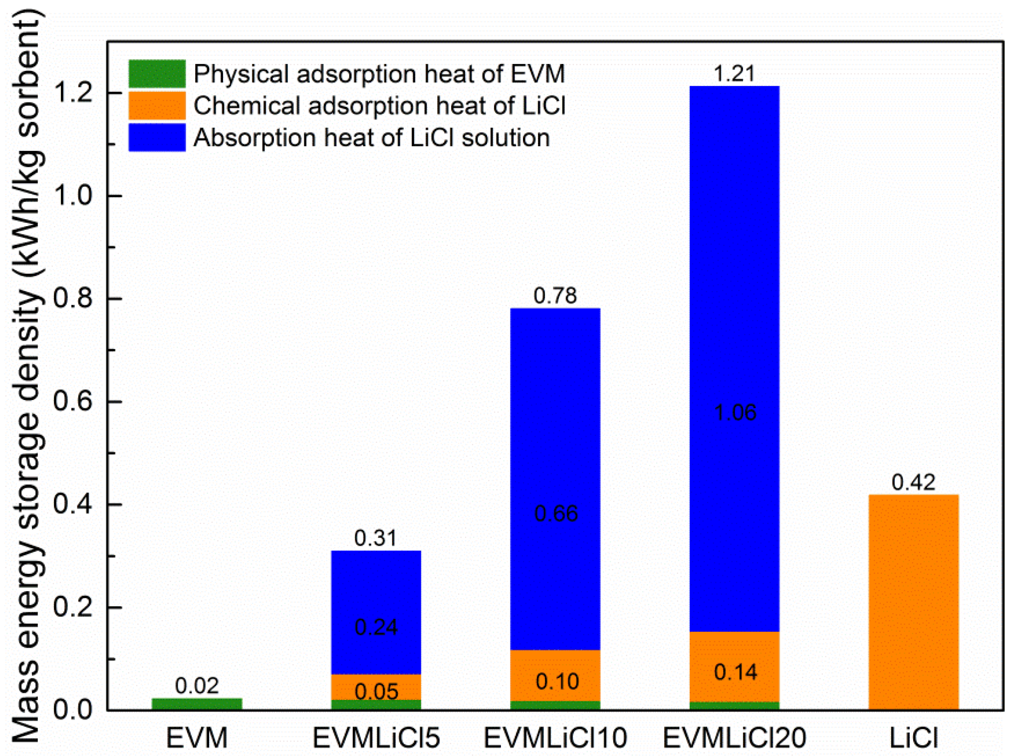 - Water uptake, mass energy storage density, and volume energy storage density increase with salt content. Water absorbed by LiCl solution contributes 83.0%–88.3% of total water uptake, and accordingly the sorption heat released in this process takes 77.4%–87.5% of the mass energy storage density. The desorption heat for losing one mole water ranges from 38 to 64 kJ. EVMLiCl20 was selected as the optimal composite sorbent, with water uptake of 1.41 g/g, mass energy storage density of 1.21 kWh/kg, and volume energy storage density of 171.61 kWh/m3.