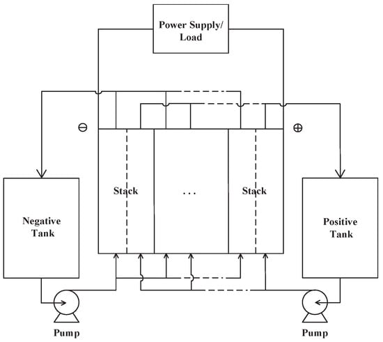 Furthermore, it is pointed out that the number of stacks used in a VRB is determined by battery nominal power and the maximum power handling capability of each stack , where (). In most cases, the maximum power that a VRB stack can handle is larger than its nominal power. For instance, a 5-kW stack can handle a peak power of 10 kW (i.e., = 10 kW), and a 30-kW stack can support charging/discharging power up to 50 kW (i.e., = 50 kW). In practical applications, the maximum power handling capability of a VRB stack is determined by its manufacturing data. Since the configuration of multiple 5-kW stacks is commonly used in the VRB system, a 5-kW stack is selected as the basic module of VRB in this paper.