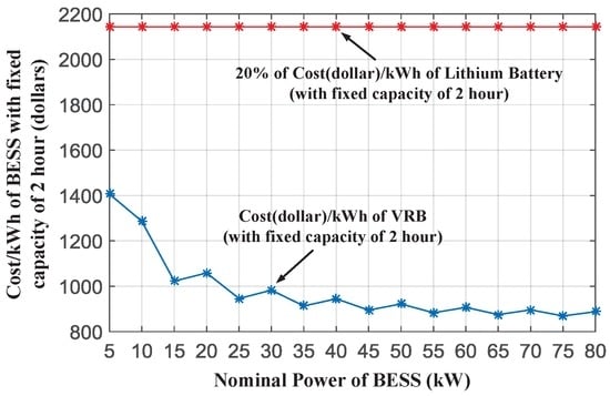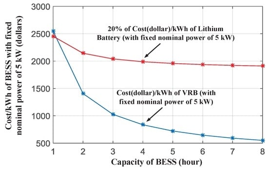 By adding up capital and maintenance costs, the overall cost of the VRB system in a 24-year lifetime can be worked out. To provide an illustrative example, the parameters for the VRB cost computation are tabulated in Table 2. Based on these parameters, the overall cost/kWh of a VRB system (overall cost/(nominal power × capacity)) can be computed. The results are shown by blue curves in Figure 2 and Figure 3, where the nominal power and capacity of BESS are varied, respectively.