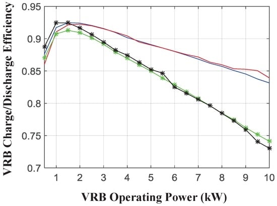 VRB charge and discharge efficiencies with respect to varying battery power: ‘−’ VRB charge efficiency with SOC starting at 10% (blue) and 40% (red); ‘’ VRB discharge efficiency with SOC starting at 80% (green) and 50% (black).
